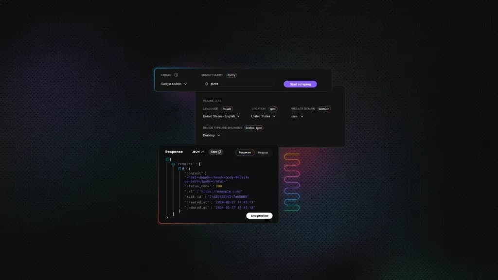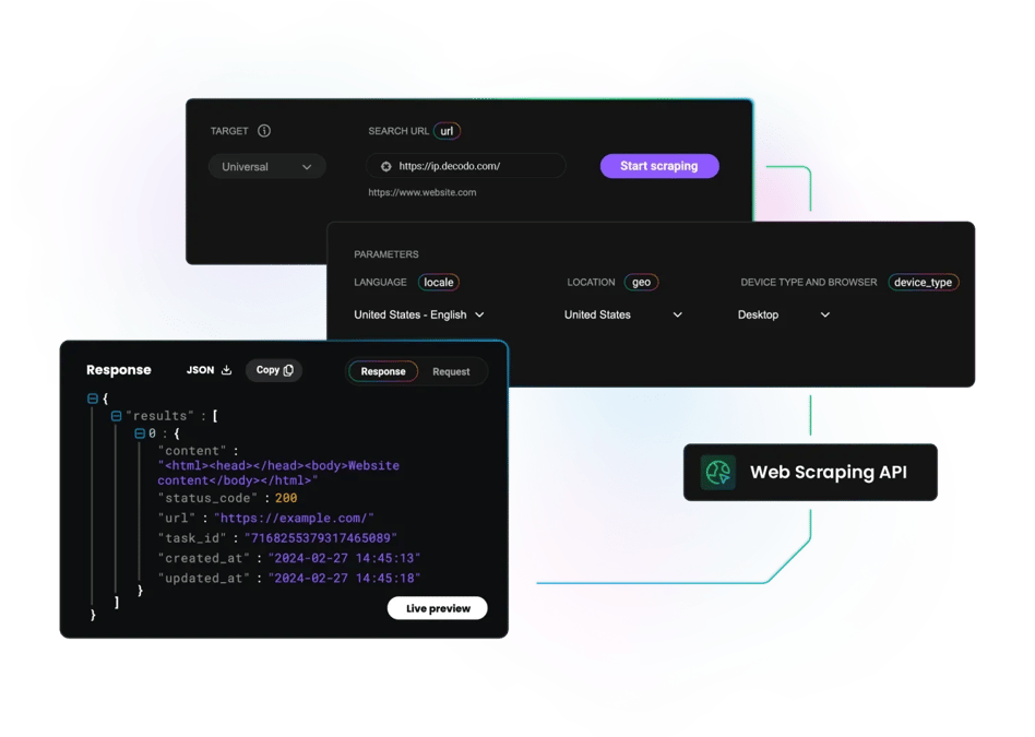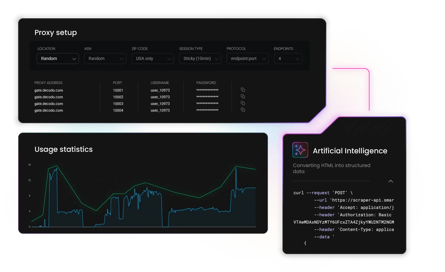 Collect public web data at scale with zero hassle. Decodo’s (formerly Smartproxy) Site Unblocker and Web Scraping API handle CAPTCHAs, IP bans, and JavaScript rendering for reliable data delivery. Learn more