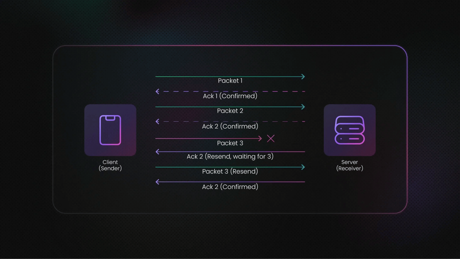 For instance, after the sender transmits the first packet to the server, it receives it and sends a confirmation back to the sender (called an acknowledgement). Once the sender receives the confirmation, it sends the next packet. This continues until all packets are successfully delivered.