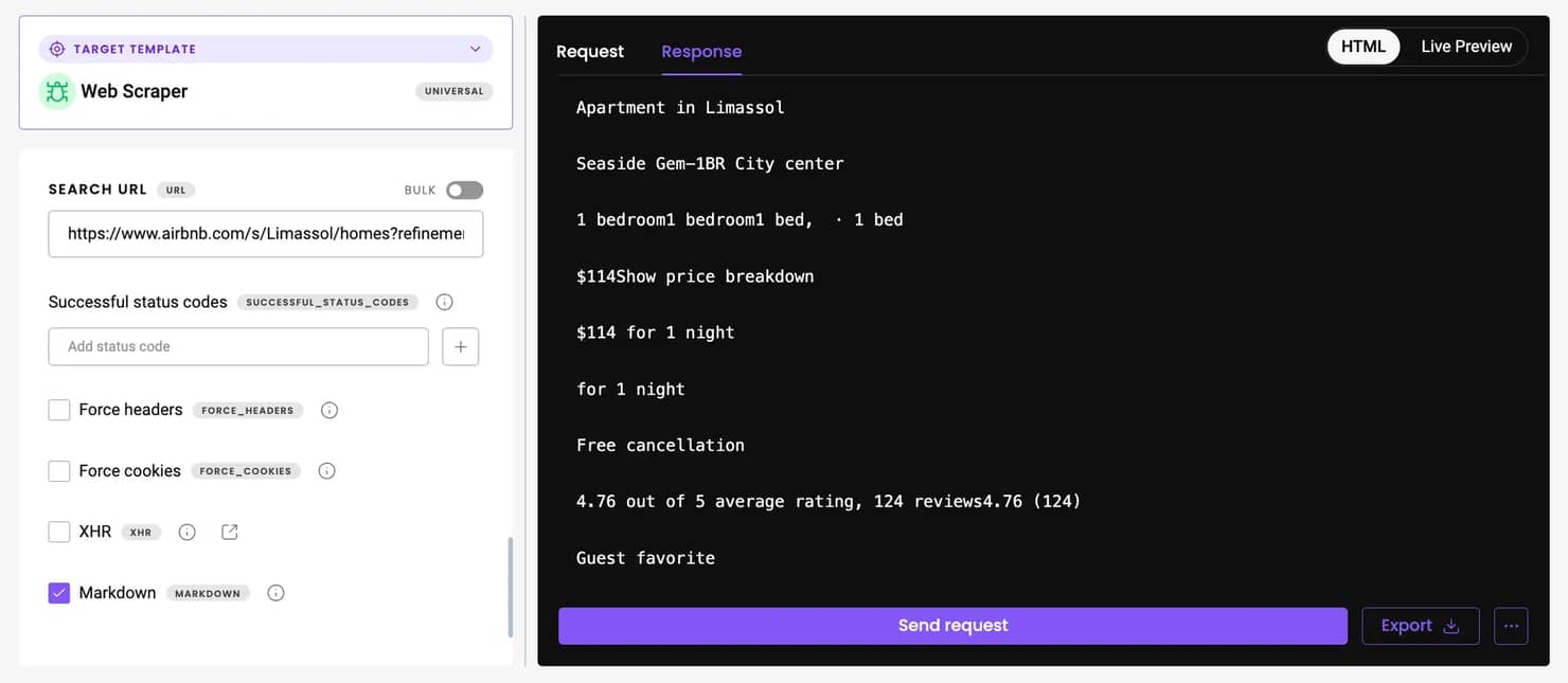 If you prefer simplicity and reliability over customization, our Web Scraping API may be the right choice. It eliminates the need to manage proxies, browsers, and anti-bot handling while still providing full access to Airbnb data in raw HTML or clean Markdown format.