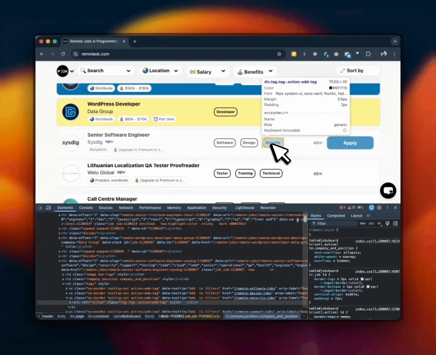 RemoteOK's job listings follow a consistent DOM structure. Inspect any listing in DevTools and the selectors surface immediately – here's what that looks like in practice: