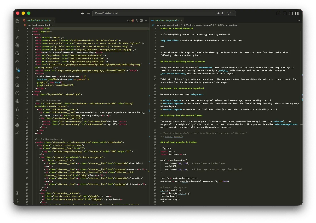 The code below fetches TechCrunch and returns it as Markdown. Since most of the page renders client-side, you get to see Crawl4AI's rendering engine in action: