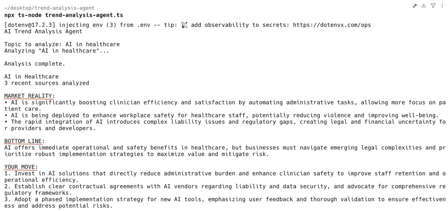 Here is the complete, final code for trend-analysis-agent.ts. You can use this to verify your work from the steps above or as a complete copy-paste reference.