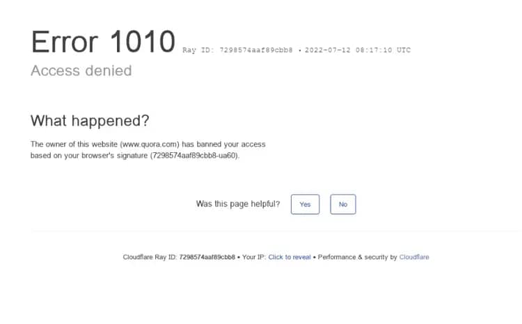 Error 1010 is an error code shown when an owner, using Cloudflare, blocks some attempting visitors to their website based on the latter’s detected traffic patterns or other features.