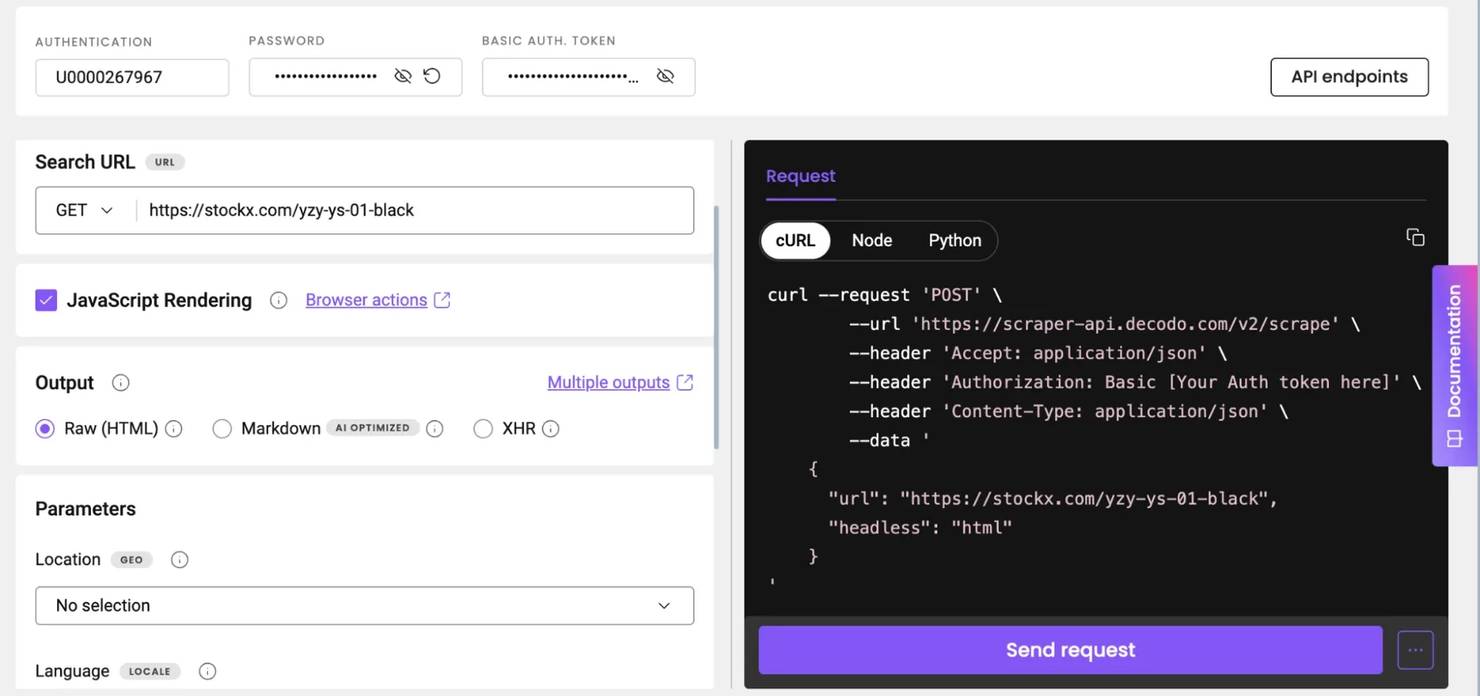 - authorization: Uses your API credentials (DECODO_AUTH_TOKEN) to authenticate the request with the scraping service. Remember to replace this placeholder with the actual value.