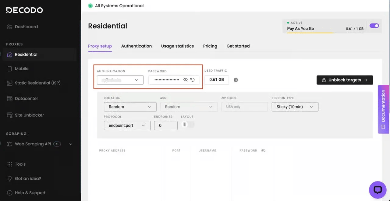 - Copy your credentials. You'll need your proxy username, password, and server endpoint to integrate into your scraping script.
