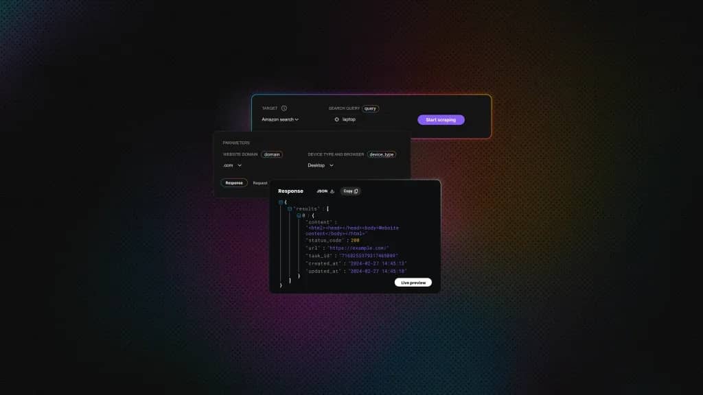 - Web Scraping API – handles proxy rotation, anti-bot bypass, and JavaScript rendering in a single call. You send a URL, get back the page content.