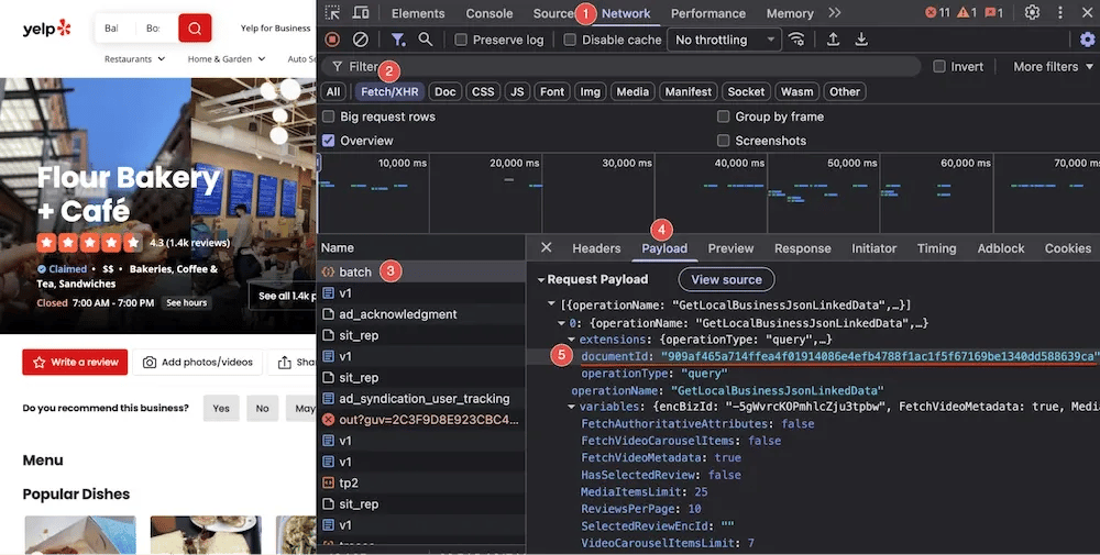 - documentId – a stable hash of the GraphQL query stored on Yelp's server. You don't send the actual query text – just this hash. If this hash stops working, see the recovery steps below.