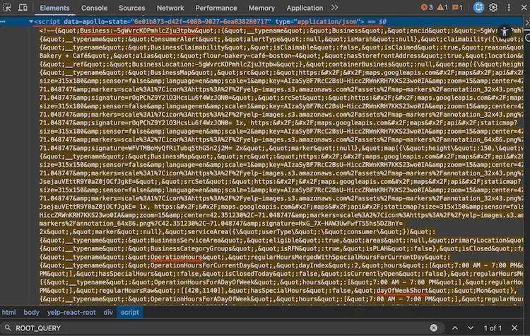 Open any Yelp business page, inspect the HTML, and search for ROOT_QUERY. You'll find a massive <script type="application/json"> tag containing the Apollo Client normalized cache, a flat JSON store with every business detail the page needs to render.
