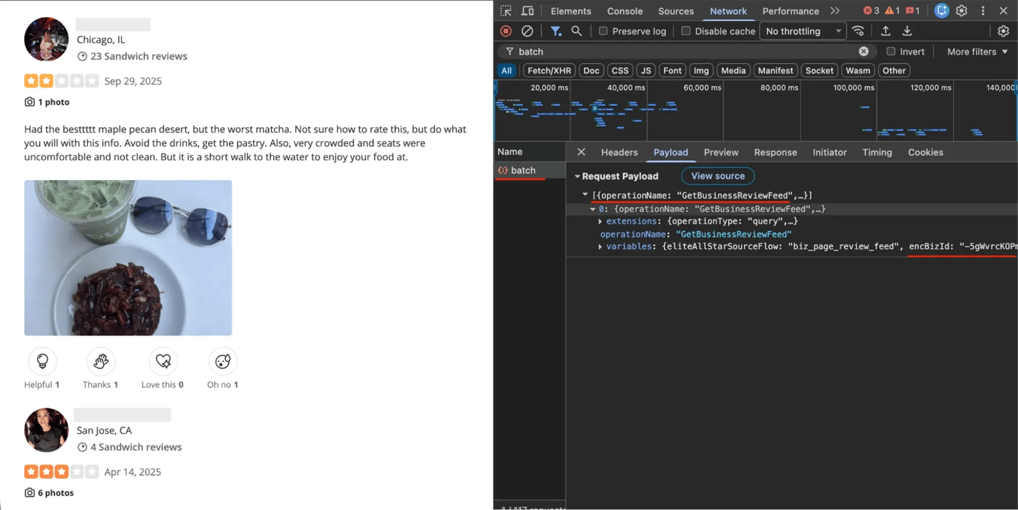 Reviews load through an internal GraphQL API at POST https://www.yelp.com/gql/batch. The operation is called GetBusinessReviewFeed and returns structured review data (full text, ratings, dates, author info, vote counts) without any HTML parsing needed.