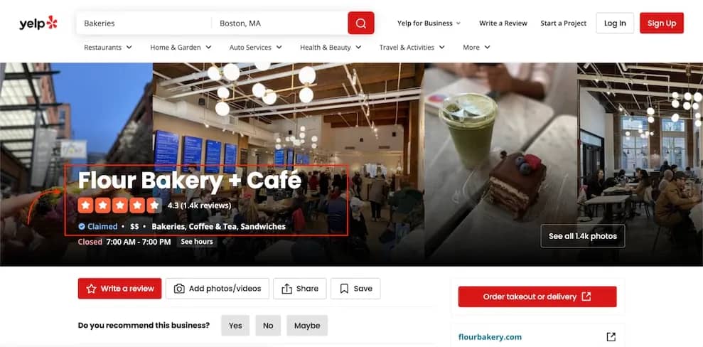A Yelp business page for Flour Bakery + Café showing the business name, 4.3-star rating, 1.4K reviews, price range, categories, and operating hours