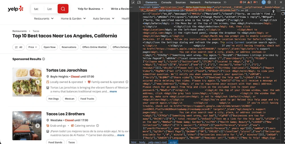 Before writing any scraping code, you need to know where Yelp actually stores its data. A common approach is to parse the visible HTML, but Yelp uses dynamically generated CSS classes that can change without notice. The more reliable data lives in 4 separate locations.