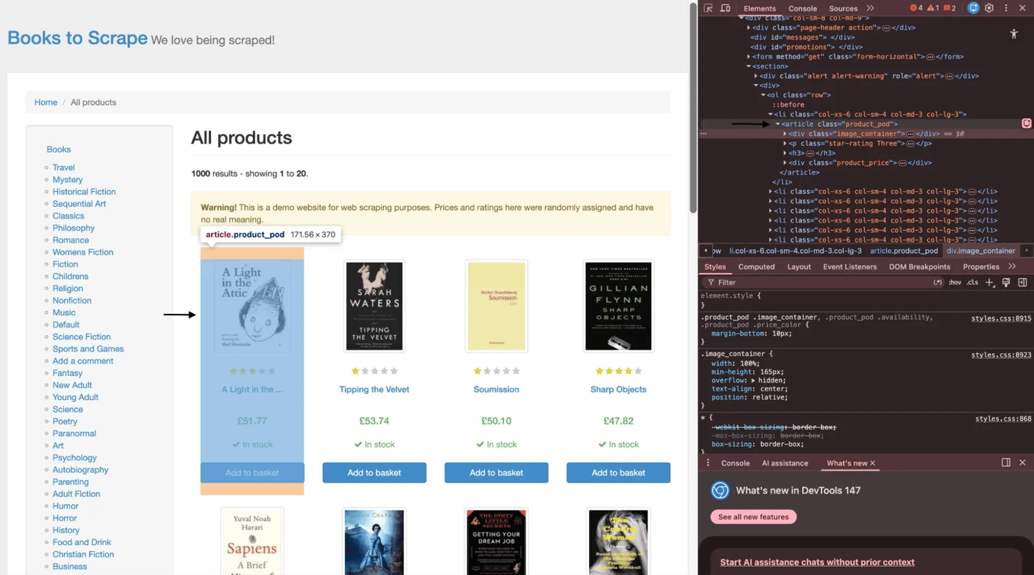 For the live examples in this guide, the target site will be books.toscrape.com. Before looking at the code, it helps to look at the page structure itself. On books.toscrape.com, each book listing is wrapped in an article.product_pod element. Inside that container, you'll find the image area, the star rating, the title link within the h3 tag, and the pricing block. That's the structure the next examples will work with.