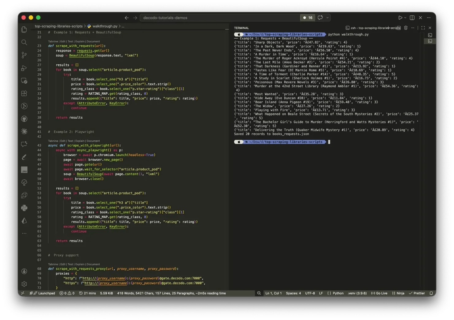 Books to Scrape is a static site, so Requests is the right tool for it. But the same extraction logic applies to JavaScript-rendered pages. The difference is in how you await and get the HTML.