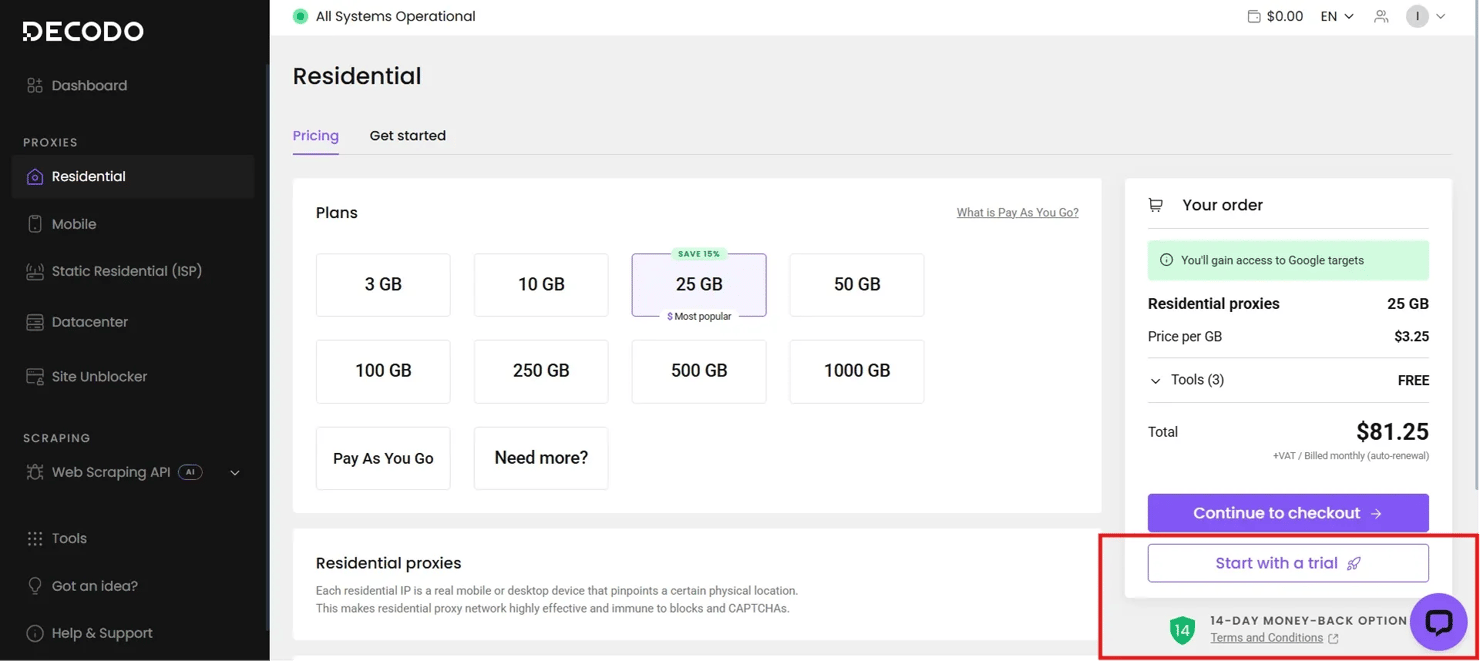 To set up your proxy, first sign up for a Decodo account. In the dashboard, select Residential, and start a free trial to access your proxy username, password, and other credentials.