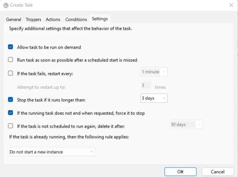 - Click Conditions. Ensure power-related restrictions are unchecked.