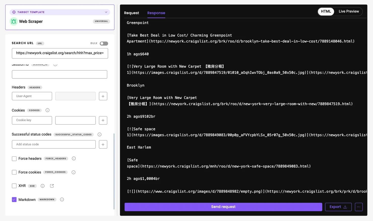 For those who value simplicity and reliability over maintaining their own scraping infrastructure, our Web Scraping API could be a more attractive choice. It removes the need to manage proxies, browsers, and anti-bot handling while still giving full access to Craigslist data in raw HTML or clean Markdown format.