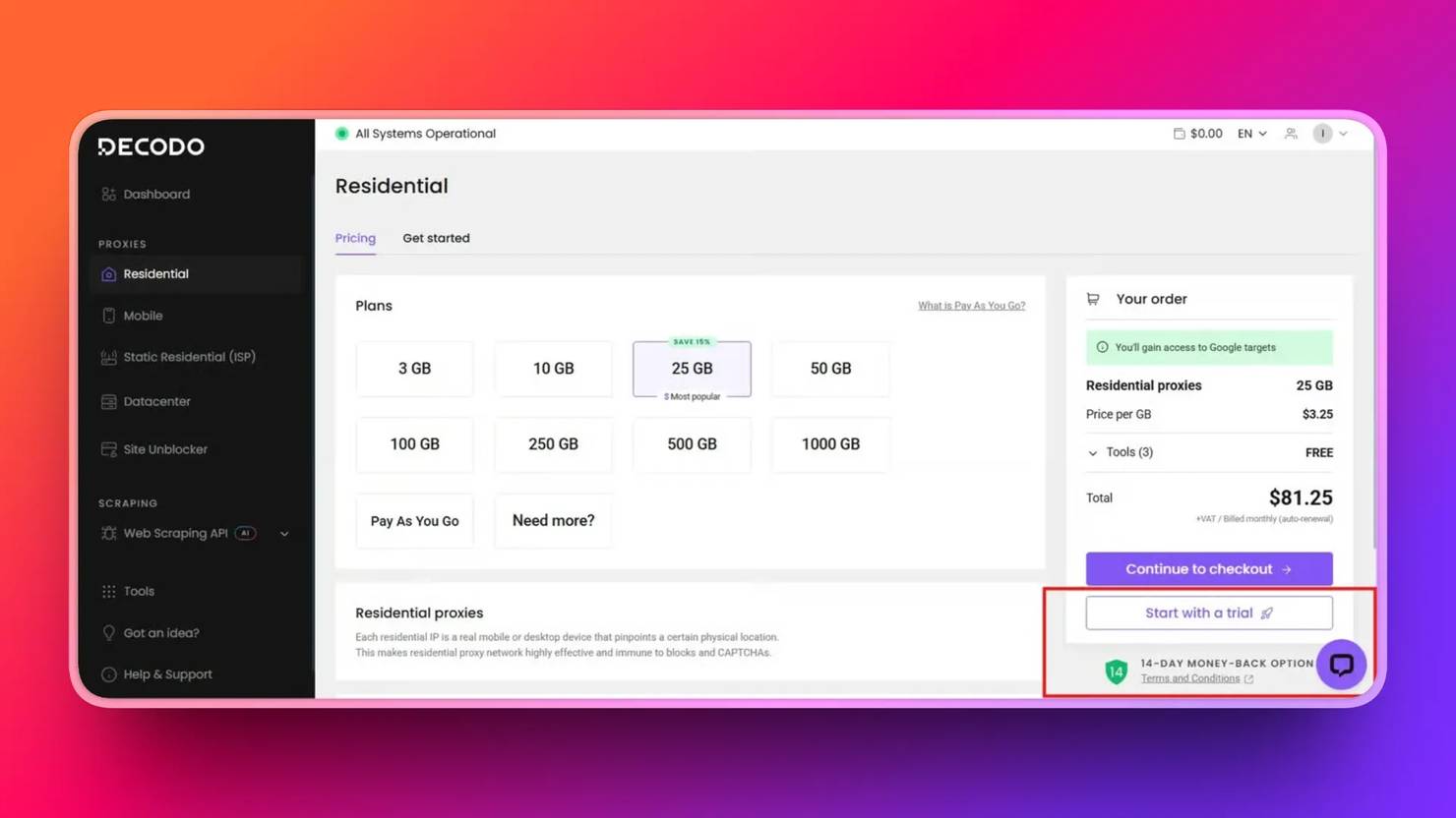 To retrieve your proxy credentials, first sign up for a Decodo account. In the dashboard, select Residential, and start a free trial.