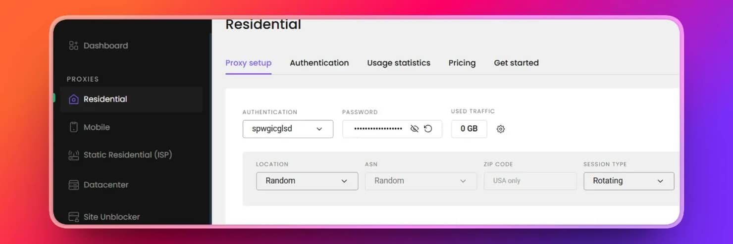 Once your free trial is activated, click Residential → Proxy setup page on your dashboard. Then click Authentication, where you will be asked to add a user or choose your whitelisted IP address. Choose 'Add User', copy your proxy credentials into your .env file, and you are good to go. Ensure the fields of the copied proxies match those below.
