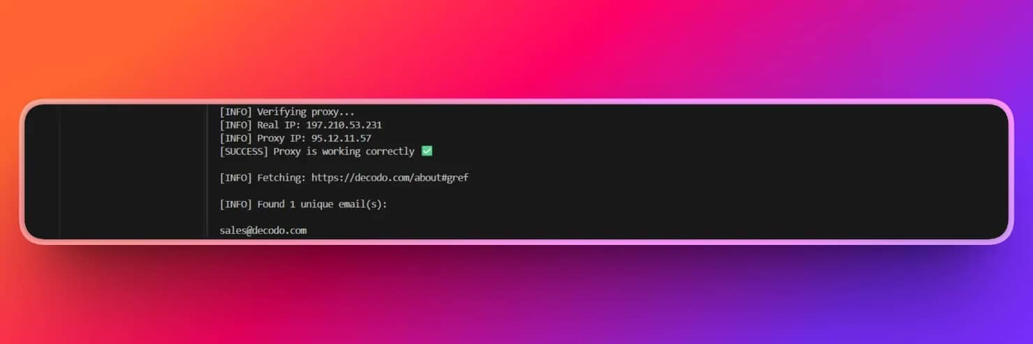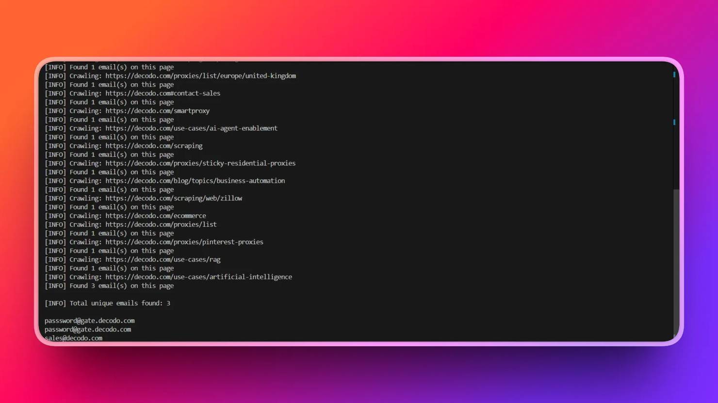 The output is every email it finds listed on Decodo's About page
