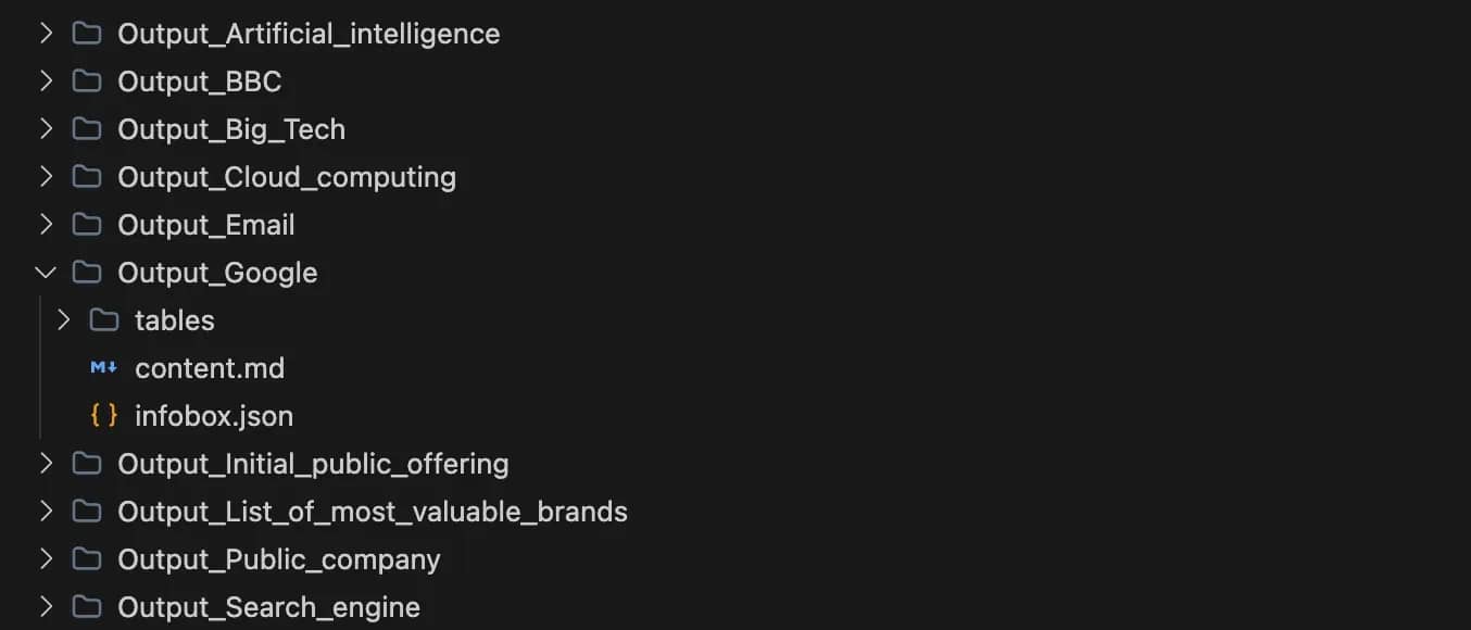 This creates an Output_Google folder containing content.md, infobox.json, and a tables/ directory with CSV files.