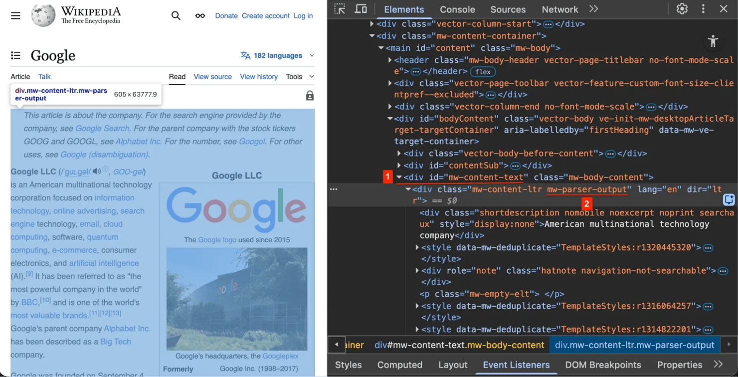 2. The content container .mw-parser-output – the actual article text is wrapped in this class. We target this to avoid scraping the sidebar menu or footer.