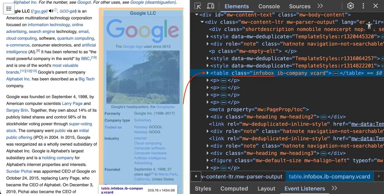 3. The infobox table.infobox – this table on the right side contains structured summary data (like founders, industry, or headquarters).
