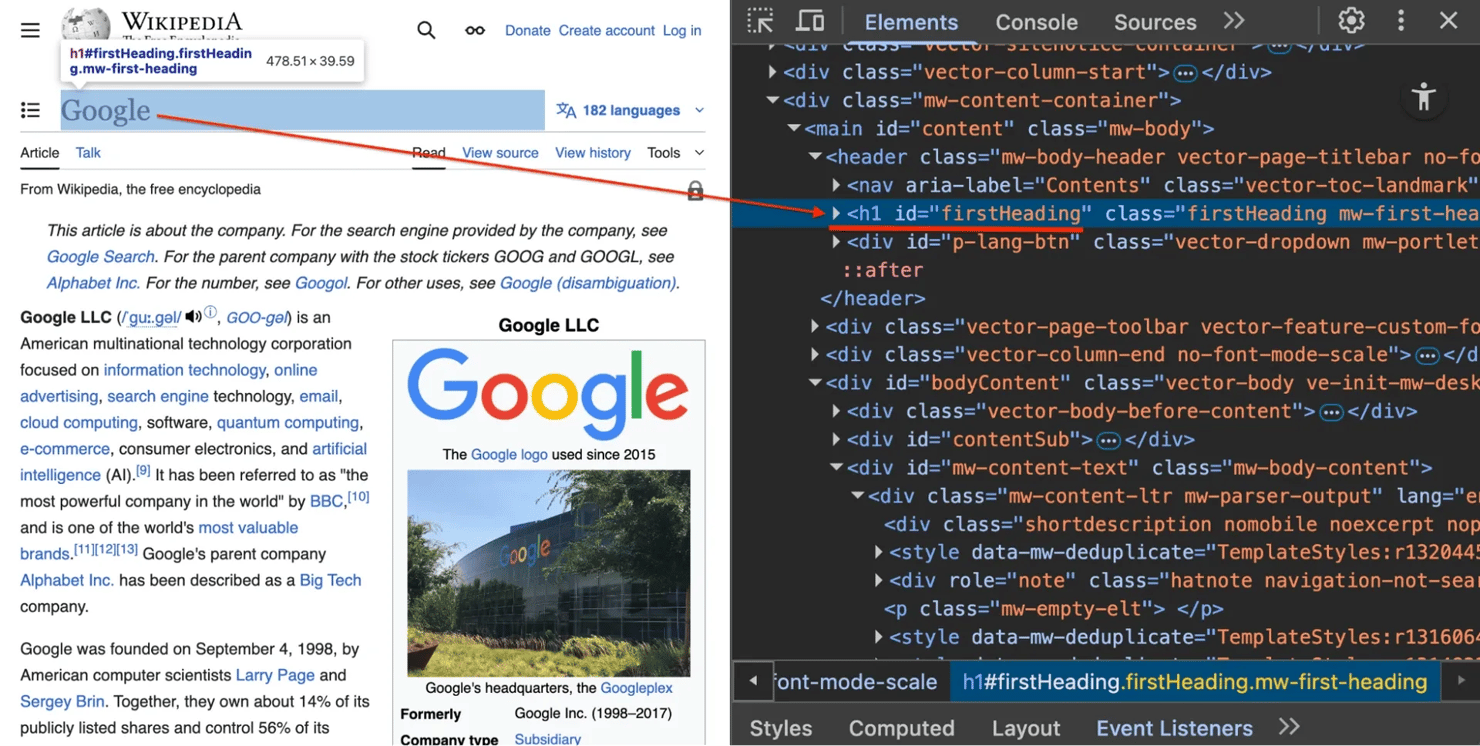 Right-click any Wikipedia page and select Inspect Element (or press F12 on Windows / Cmd+Option+I on Mac). You'll see these key structural elements: