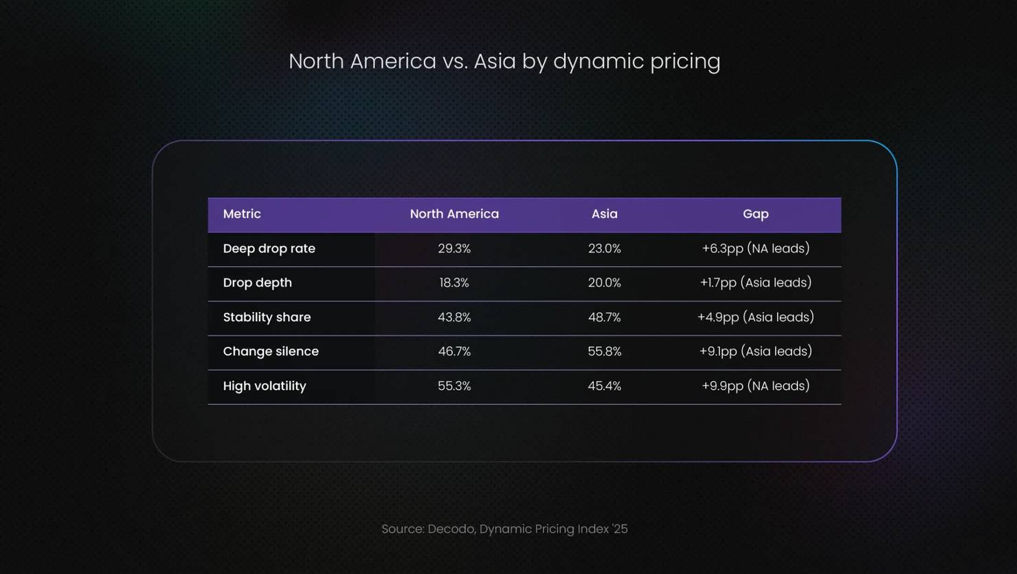 Asia’s stability share is 48.7%, compared to North America’s 43.8%. This means that nearly half of all pricing patterns in Asia showed consistent, unchanged pricing over extended periods. For consumers, this translates to a more predictable shopping experience where the price you see today is likely to be the price tomorrow.