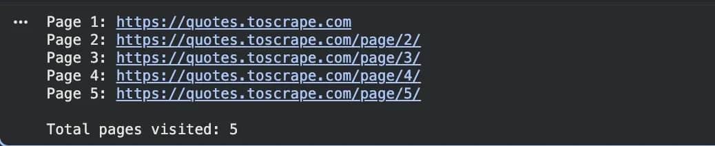 When you run this you'll see the crawler follow the Next button through 5 pages automatically, printing each URL as it goes: /page/2/, /page/3/, and so on.