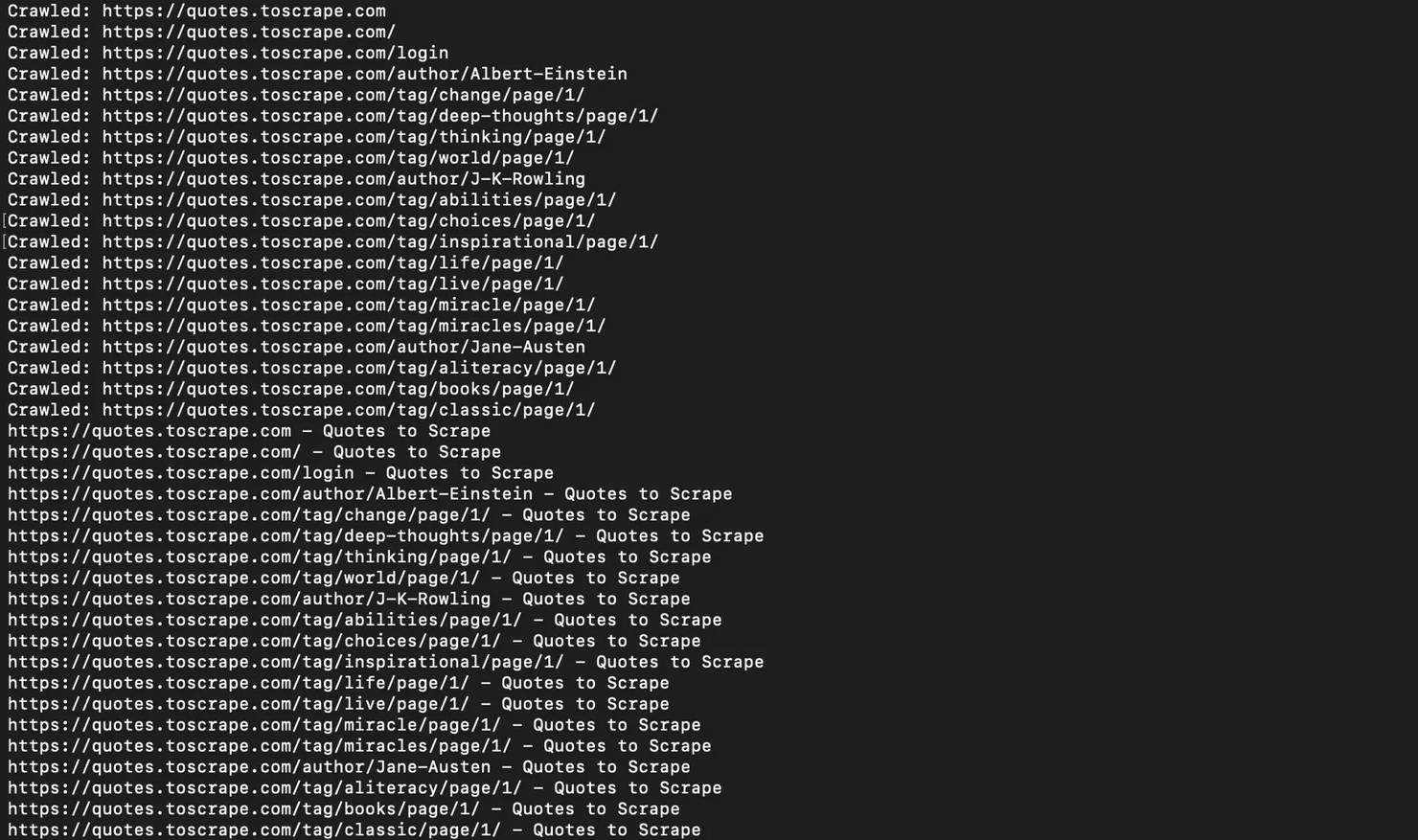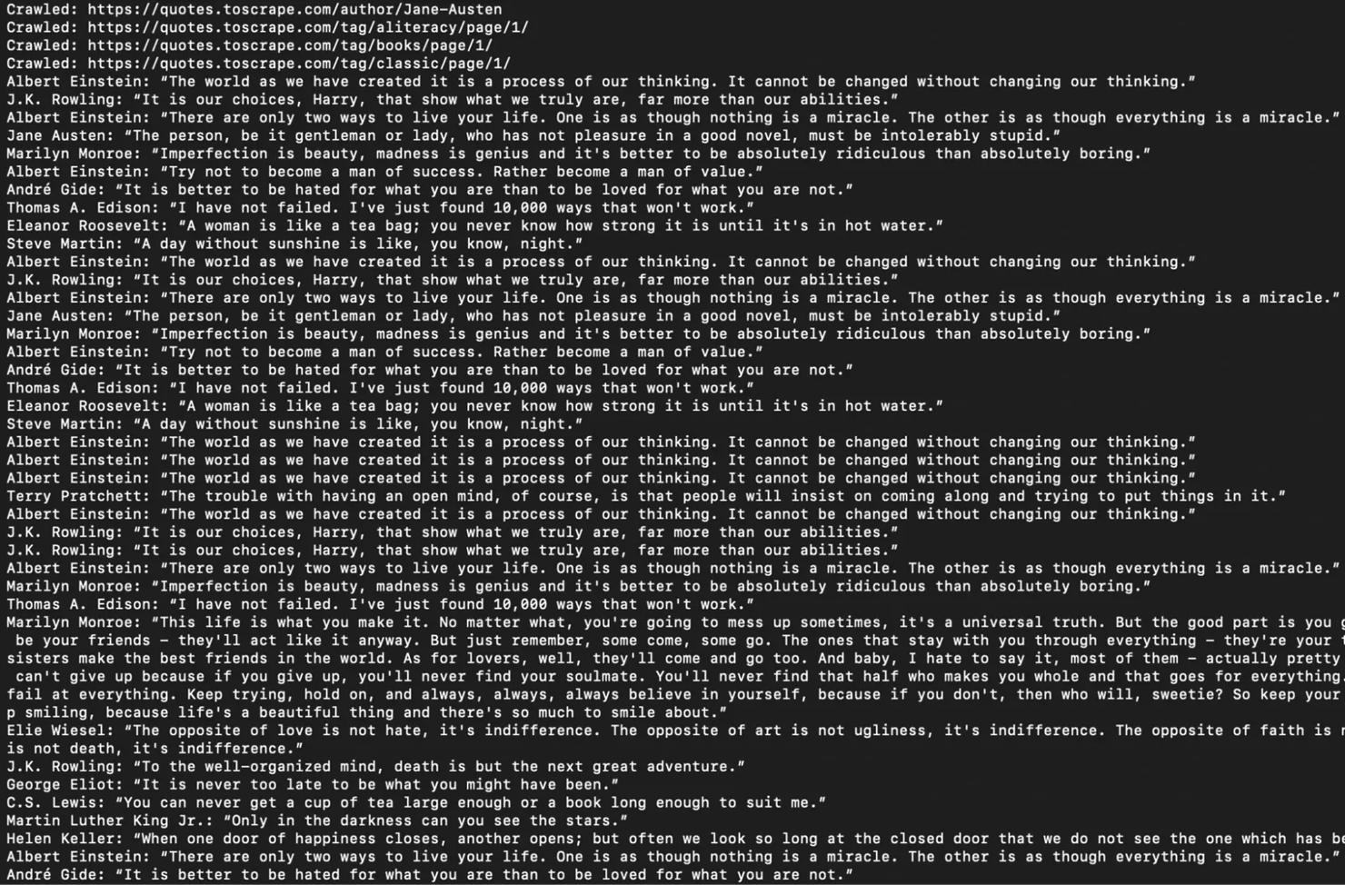 Run it with python quotes_crawler.py and you'll see the actual quotes printed alongside their authors as each page is visited.