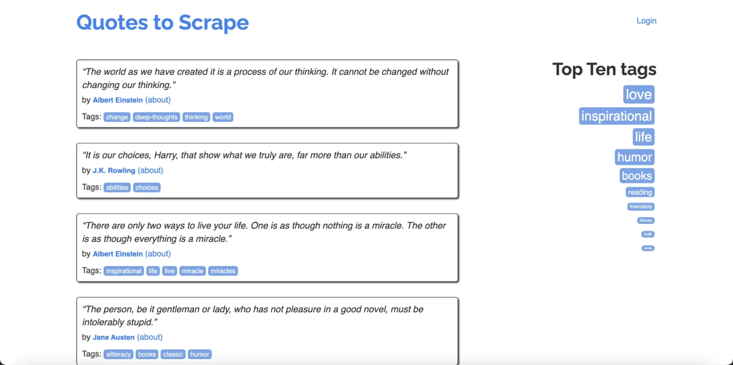 Let's build a crawler that systematically visits pages on Quotes to Scrape, a site designed for exactly this kind of practice. It has clean HTML, pagination, author pages, and tag pages, which gives enough link variety to make it a realistic test without any anti-bot headaches.