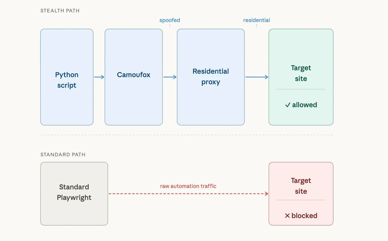 The diagram below shows how the pieces connect. With standard Playwright, raw automation traffic goes directly to the target and gets blocked. With Camoufox and a residential proxy, the traffic passes through a spoofed fingerprint layer and a residential IP before reaching the target:
