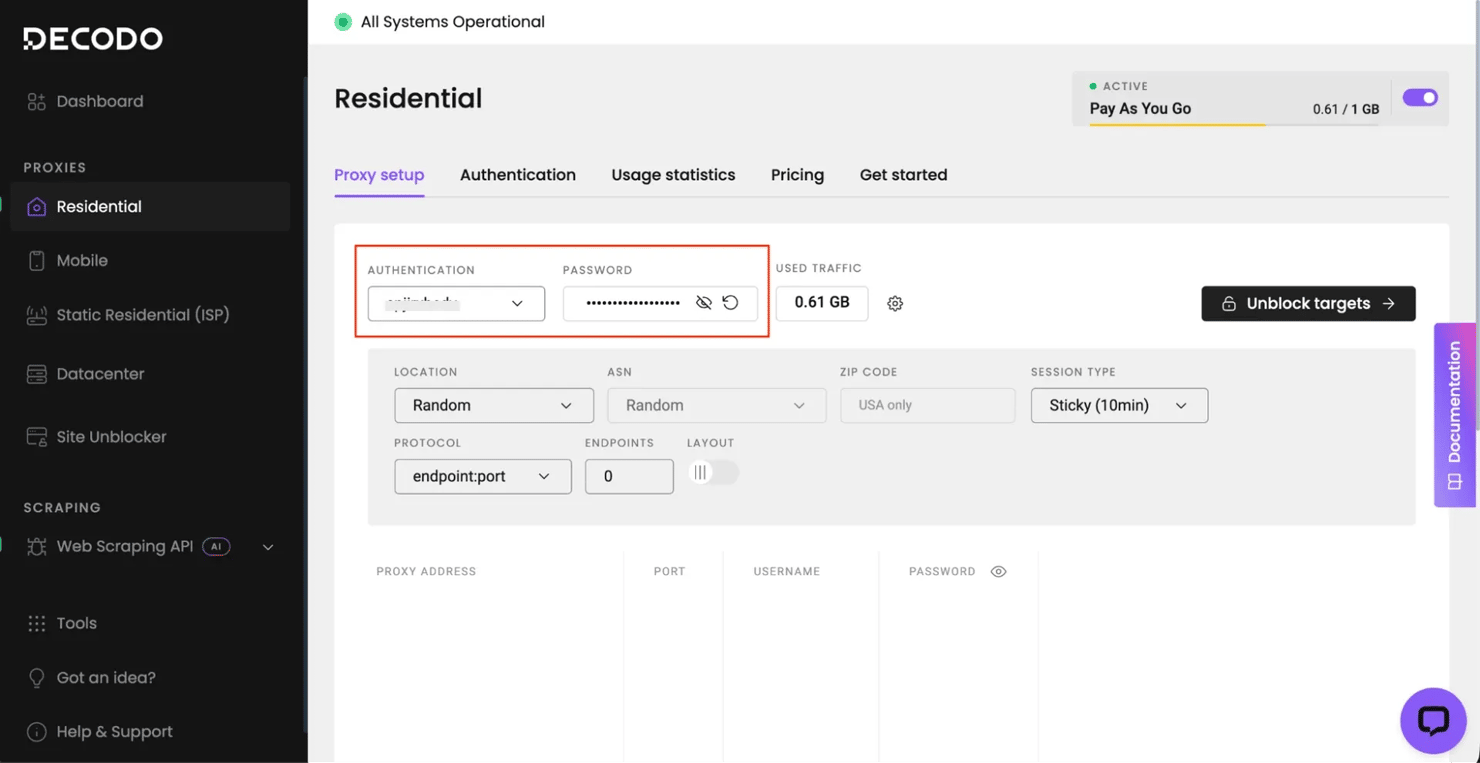 Sign up for a Decodo residential proxy plan – new accounts get a free trial with up to 2,000 requests (at time of writing), enough to run every example in this guide. The residential proxy quick start guide walks through authentication setup, endpoint configuration, and usage tracking. After registration, open the dashboard, select Residential in the left sidebar, and copy the Authentication username and Password from the Proxy setup tab: