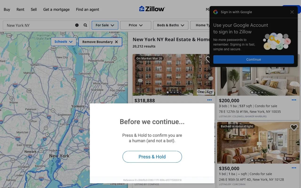 Results on Zillow are inconsistent. Some sessions extract data without issues. Others trigger a PerimeterX "Press & Hold" interactive challenge. The challenge appears either as an overlay on partially loaded content or as a full block page with zero data.