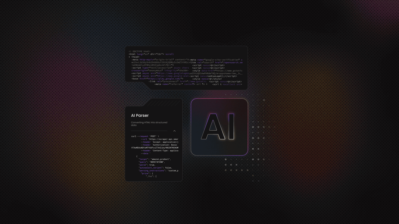 AI scraping is a method of extracting structured data by using AI models that understand the meaning of a page instead of relying on fixed, predefined selectors. Unlike traditional scraping, you don't have to map every CSS or XPath rule by hand. The model interprets the HTML like a human and delivers clean and consistent results even when the layout changes. AI tools like Decodo AI Parser give you a stable scraper you can easily use just by describing what you want to scrape in natural language.
