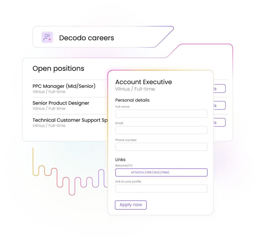 At Decodo, we’re crazy about big data and all things technology. Driven by the same passion, we create user-friendly solutions to even the most complex data-gathering challenges. Forget about hierarchies – we value fresh ideas and thrive on daily collaboration to bring them into reality. With our strong ownership mindset, we take pride in our work, celebrate our wins, and learn from our failures. Sounds like you? Become a part of a dynamic and innovative team that's shaking things up in the tech industry.