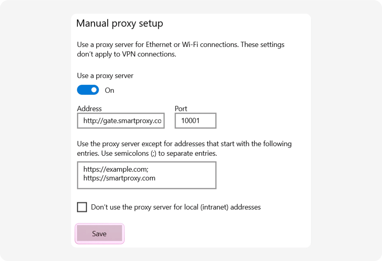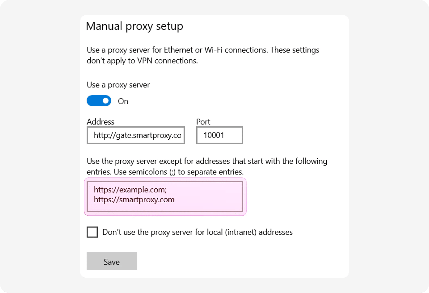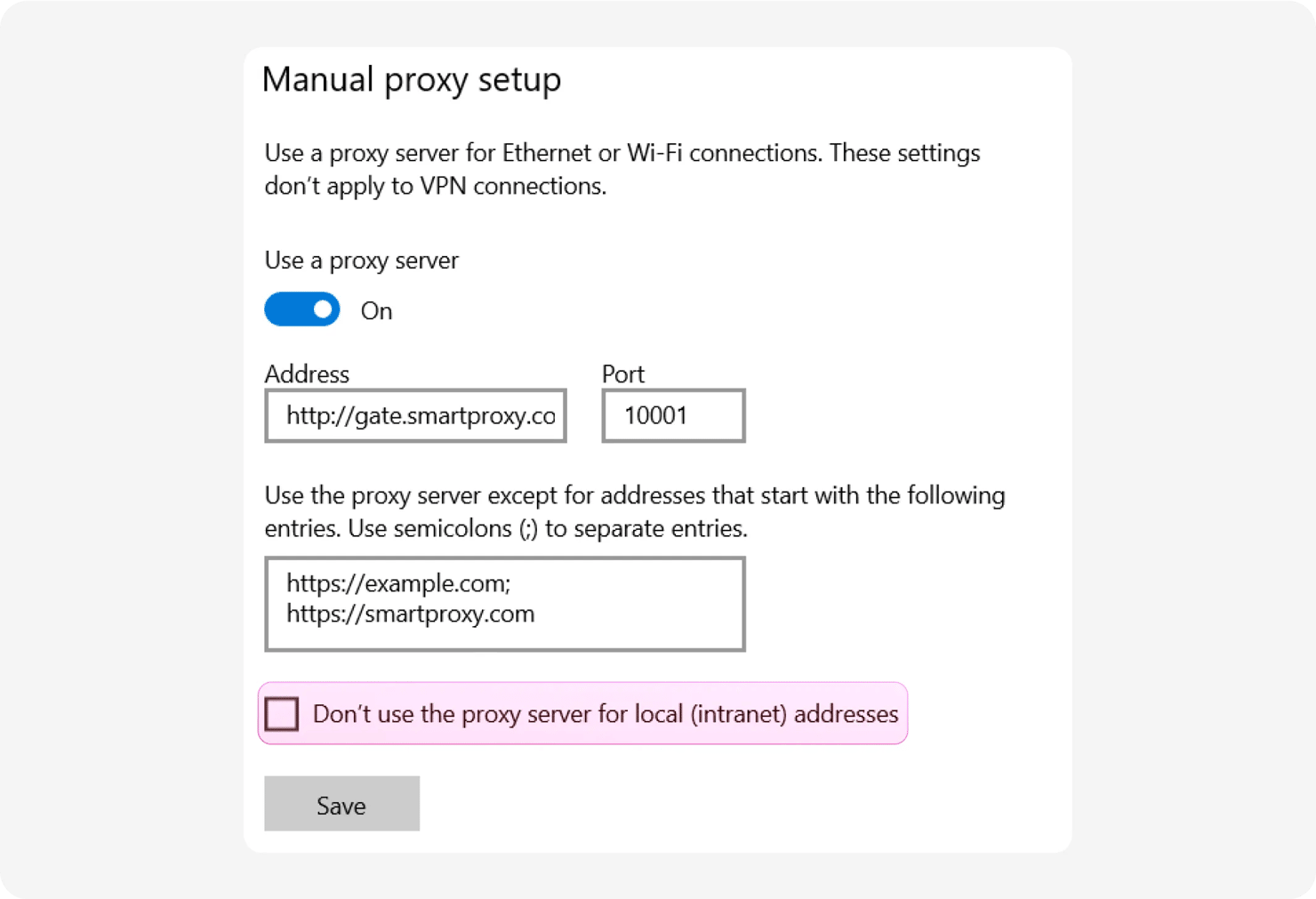5. Decide if the proxy should be used for internal addresses. It ensures that addresses within your private or corporate network bypass the proxy server and are handled directly. This prevents unnecessary routing of internal traffic through the proxy.