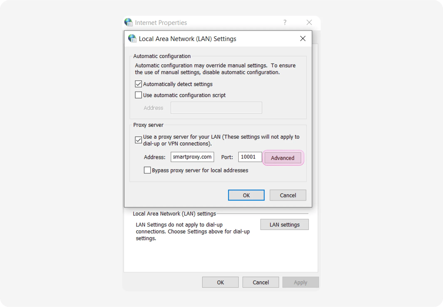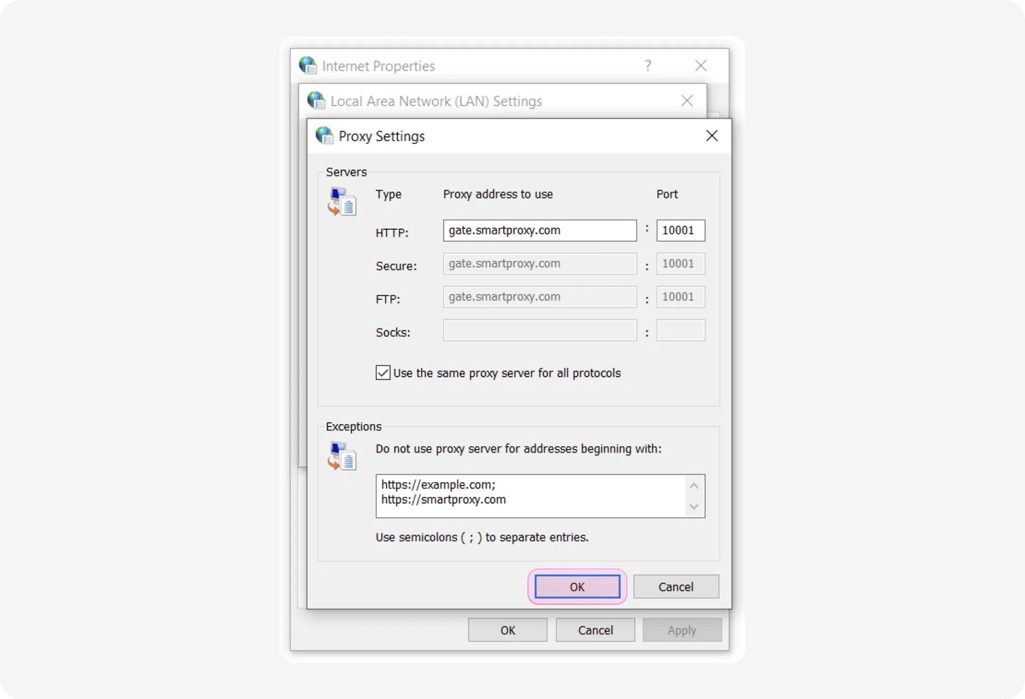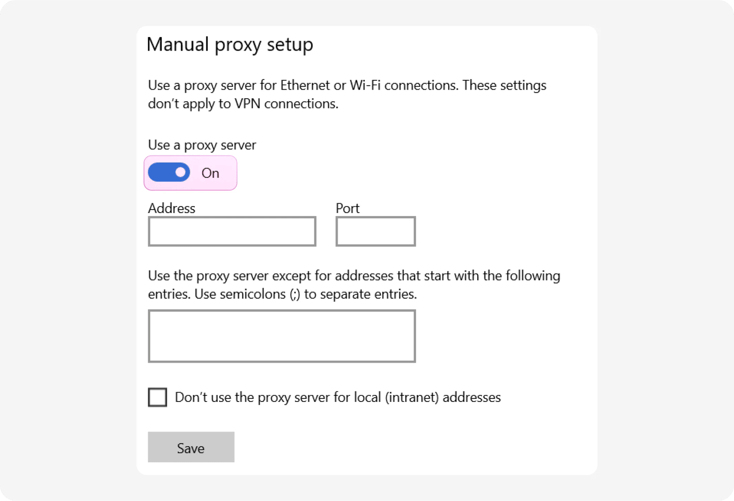 5. Decide if the proxy should be used for internal addresses. It ensures that addresses within your private or corporate network bypass the proxy server and are handled directly. This prevents unnecessary routing of internal traffic through the proxy.