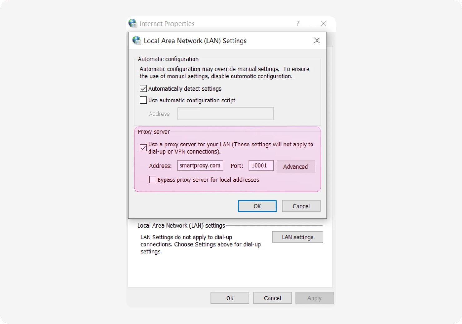 5. Enable Use a proxy server for your LAN. Enter the proxy Address and Port information in plain format. If needed, you may also enable Bypass proxy server for local addresses.