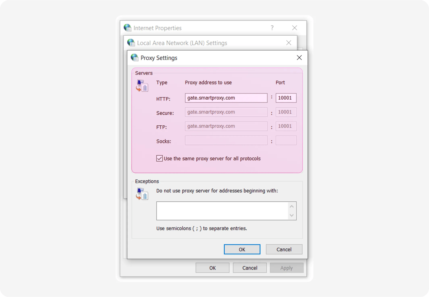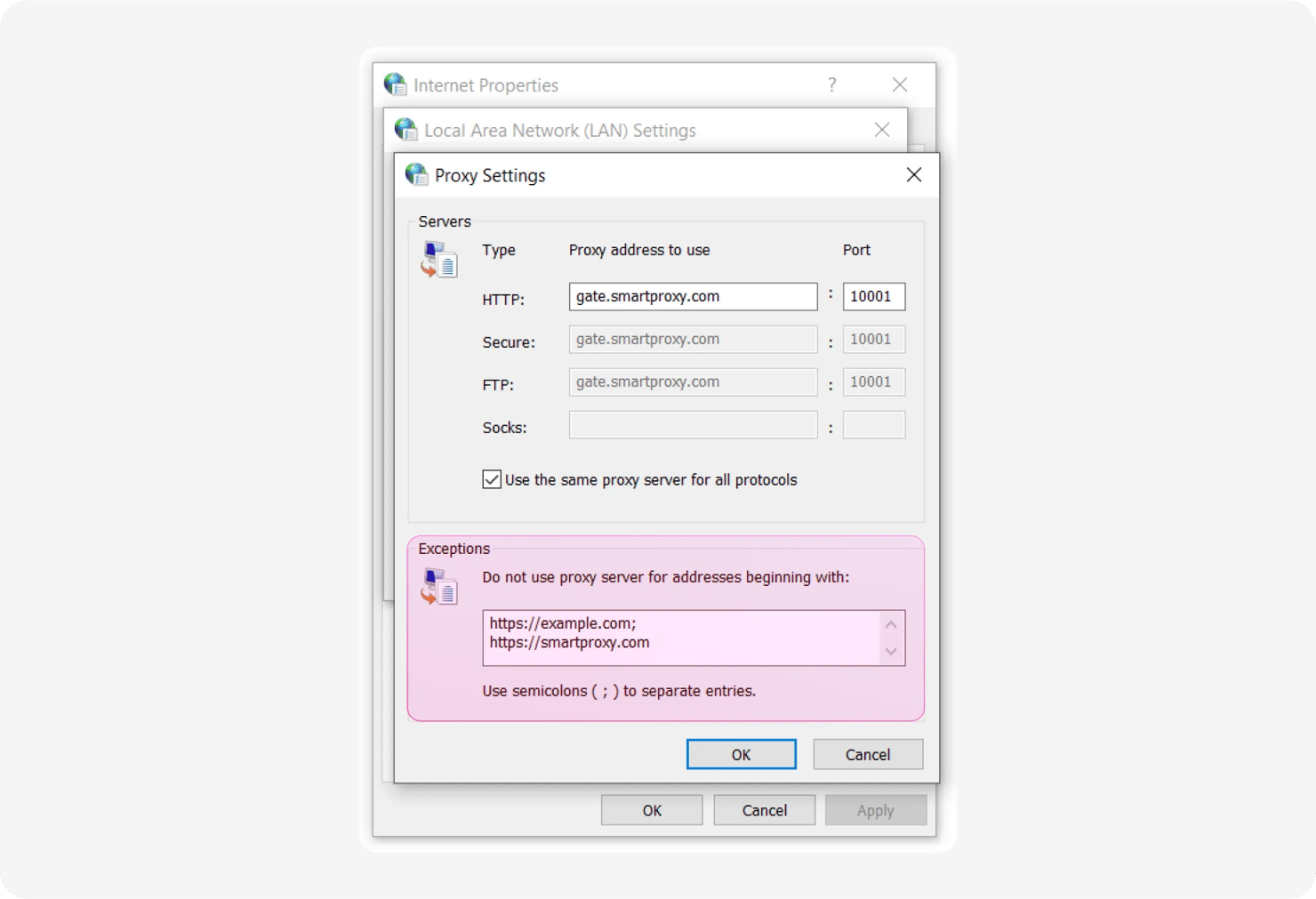 8. In the Exceptions section, enter web addresses for which a proxy server shouldn't be used, separated by a semicolon (;).