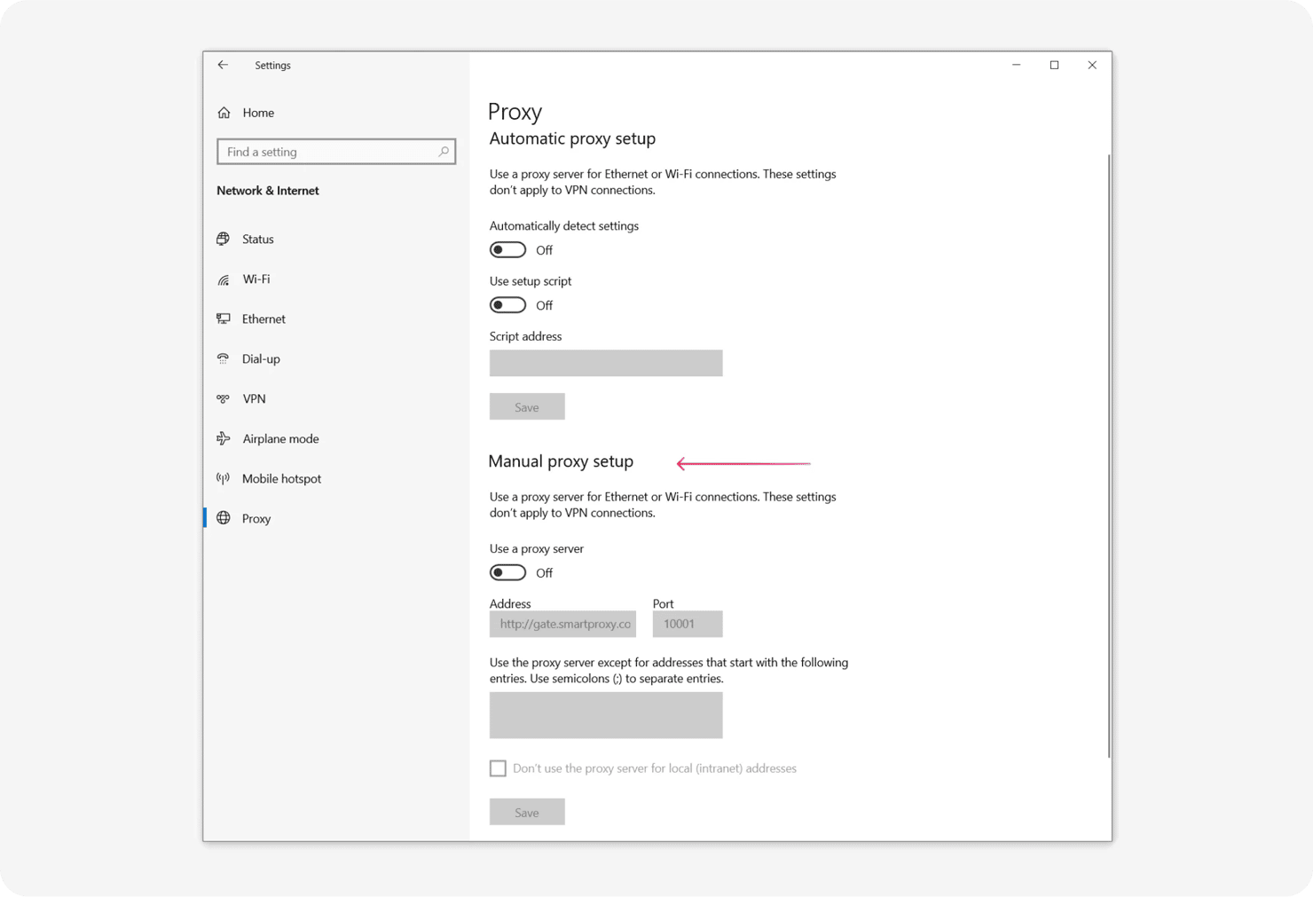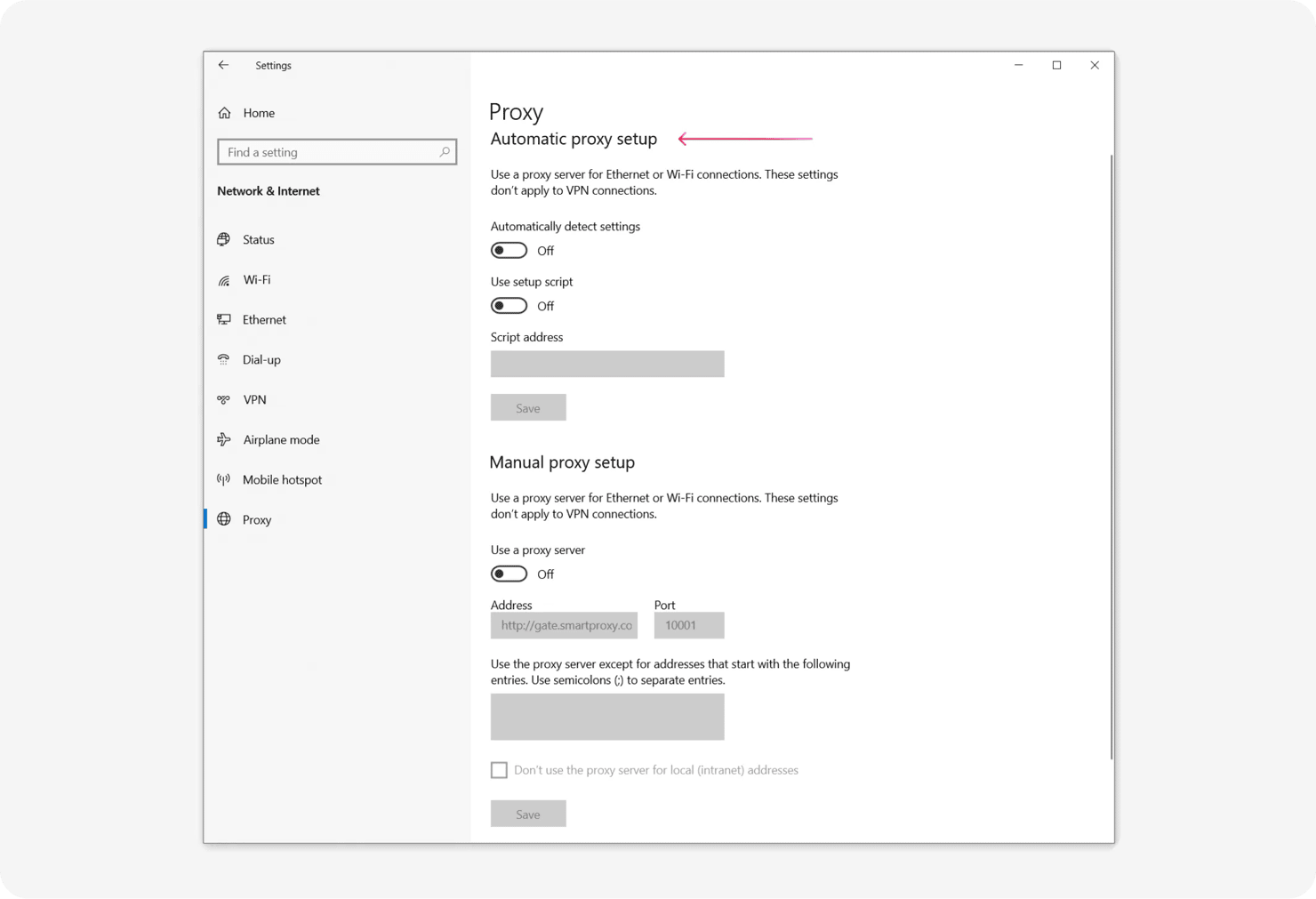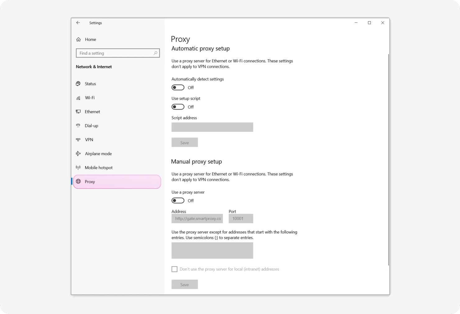 Proxy settings in Windows are in Settings > Network & Internet > Proxy. In this section, you can manage both manual and automatic proxy configurations.