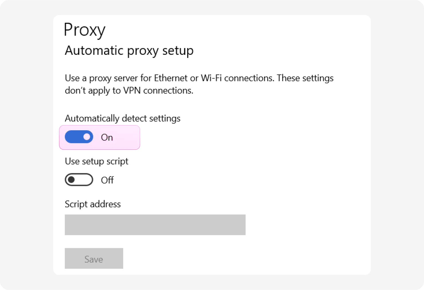 2. Toggle Automatically detect settings. This enables the system to use the Web Proxy Auto-Discovery Protocol (WPAD) to detect and configure proxy settings on your network automatically. The feature is primarily used by companies to allow computers to access internal networks.