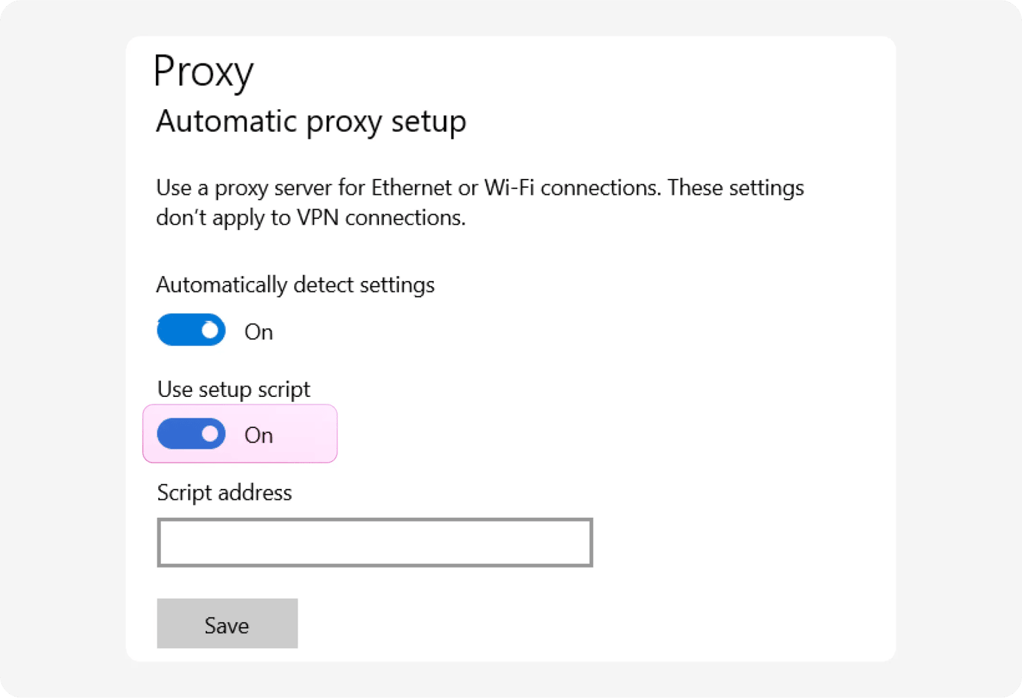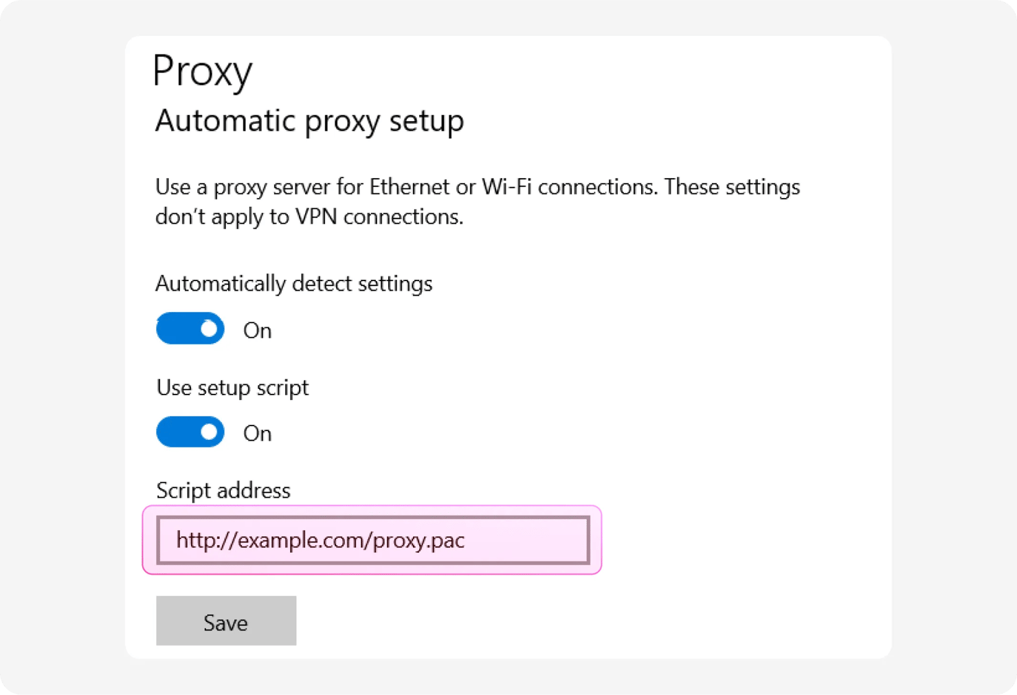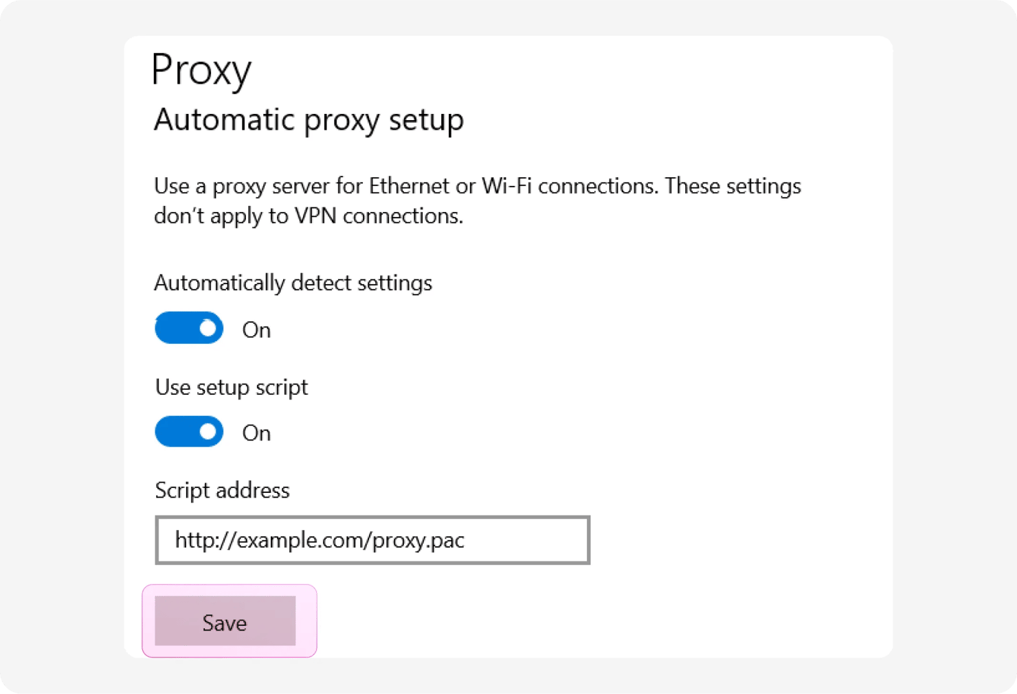 4. Provide the PAC file URL in the Script address field. This file contains rules for how the system should handle web requests and which proxy servers to use.