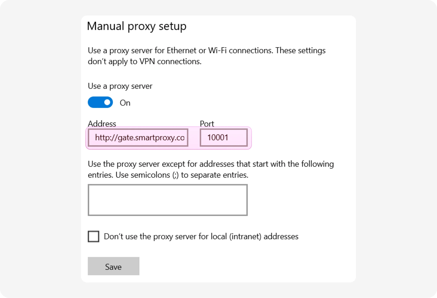 3. Enter the Address and Port of the proxy. You can get them easily from the Decodo dashboard. These proxies must be in HTTP or HTTPS format only. For SOCKS5 proxies, read the section below.