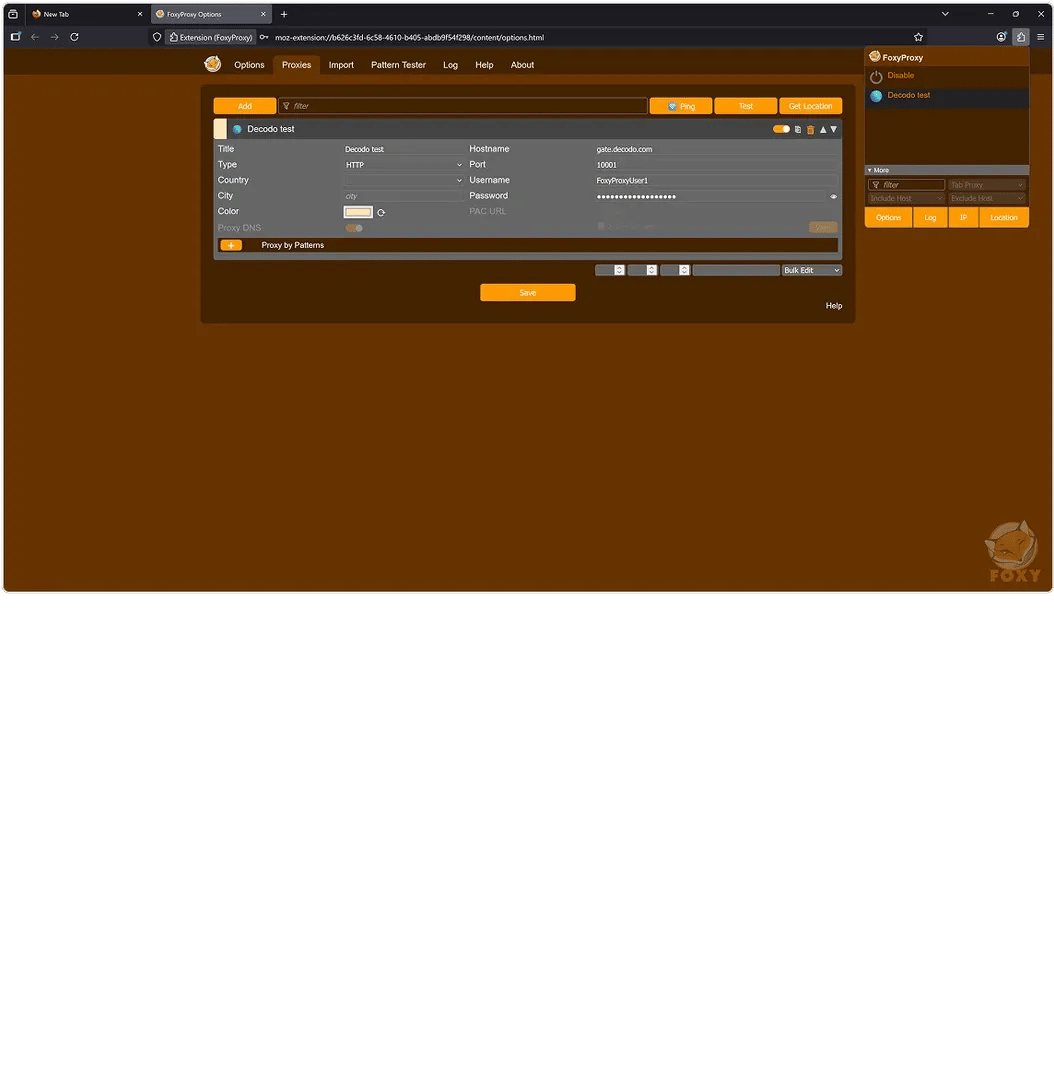 If you’re using Decodo proxies, you can point FoxyProxy to Decodo’s rotating endpoint on port 7000. With this setup, FoxyProxy always connects to the same endpoint, while Decodo automatically assigns a new IP for each request, eliminating the need for manual switching.