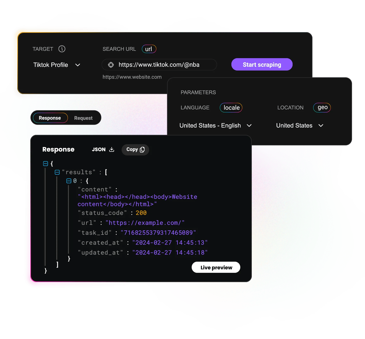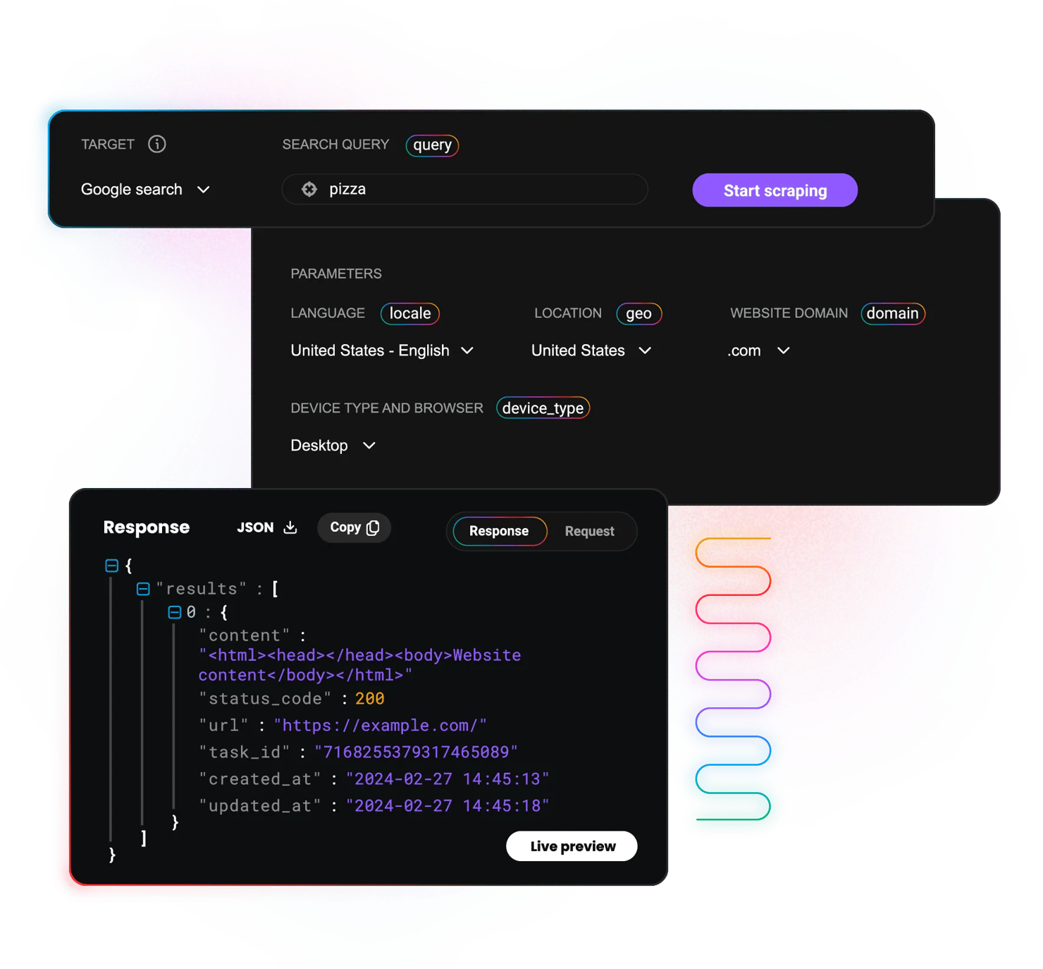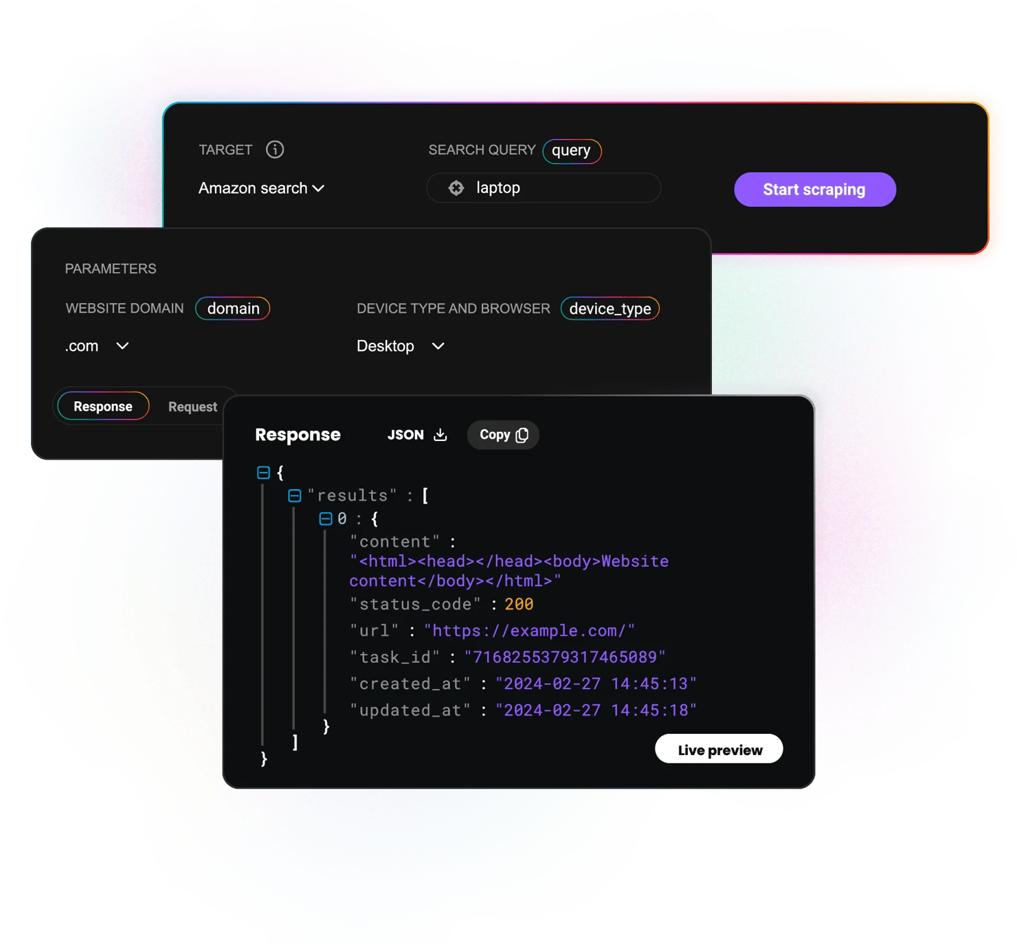 Gather HTML, JSON, and CSV data using our powerful web scraping API from eCommerce marketplaces, search engine results pages, social media platforms, and other websites.
