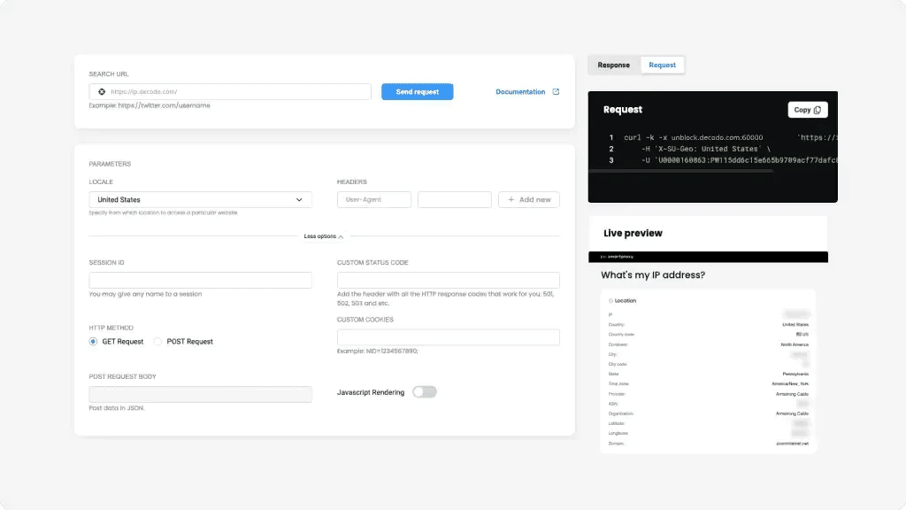 Site Unblocker can be easily integrated as a proxy using a single endpoint in cURL, Python, or Node.js. This solution chooses the most appropriate proxy type in our pool against the target you wish to access and retrieves its data in HTML with JavaScript.