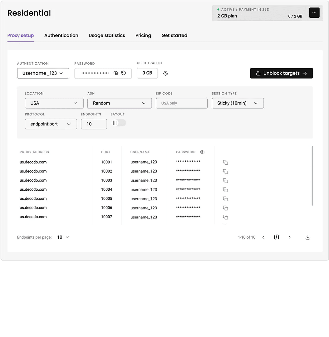 That said, a browser fingerprint alone isn’t enough. You still need high-quality residential proxies to make you appear like a regular internet user. When you pair Decodo proxies with AdsPower, each profile gets its own genuine residential IP, making every account appear as if it’s being used by a real person from a real household device. The result is safer account management, fewer bans, and smoother scaling across multiple platforms.