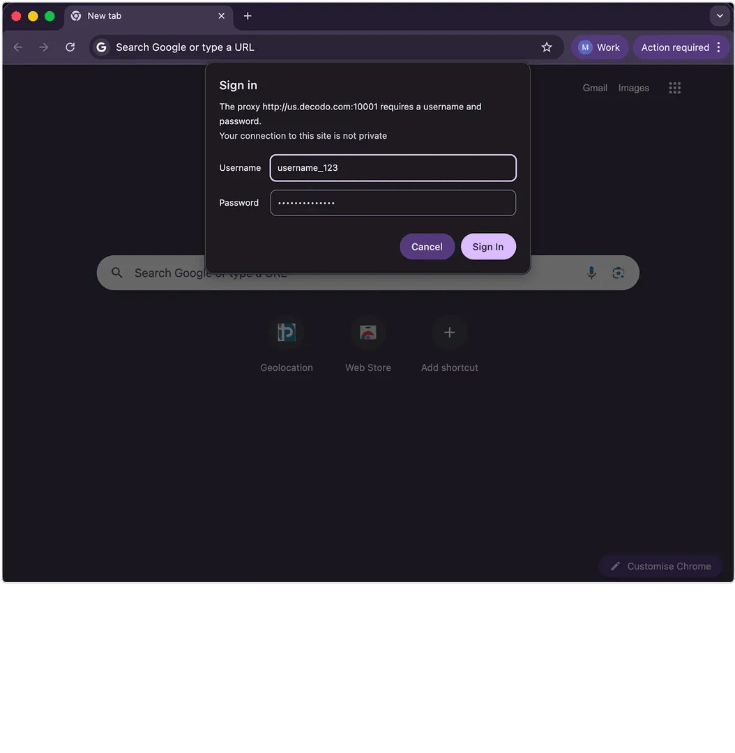 10. A pop-up will appear asking for a username and password, enter your Decodo credentials