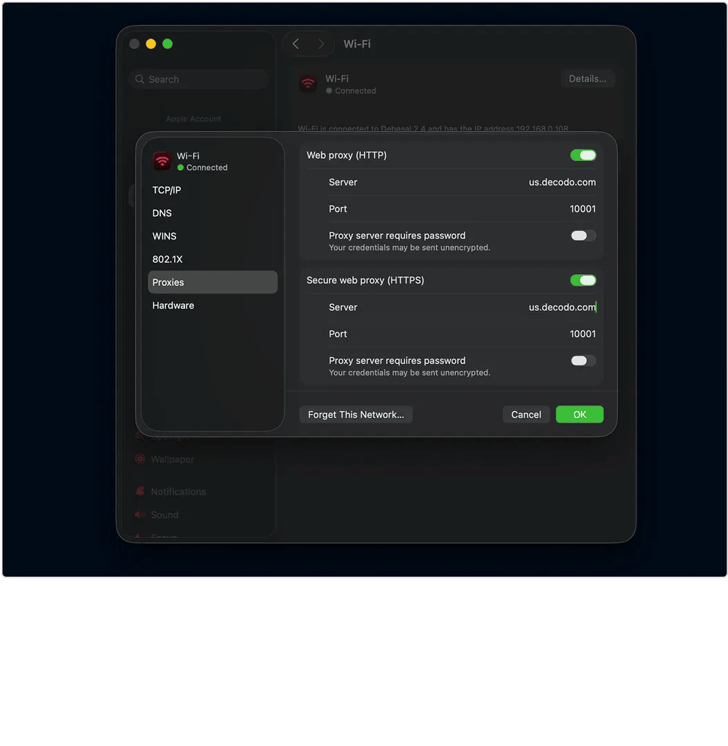 1. Select your network, for example, Wi-Fi or Ethernet, and click Details, then Proxies